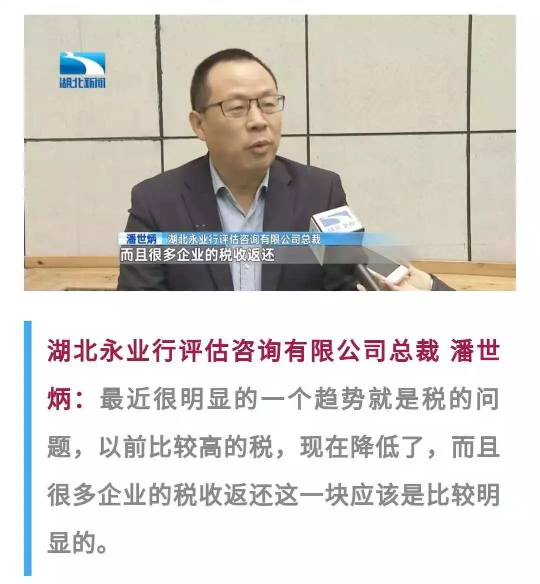 永业行董事长兼总裁潘世炳在接受湖北电视台采访时表示,习近平总书记的重要讲话,充分肯定了民营经济的重要地位和作用,进一步阐明了党中央鼓励、支持、引导民营企业发展的一贯立场,让我们倍感振奋、深受鼓舞。针对中央提出的支持民营企业发展的6个方面政策举措,湖北前期已经出台了一系列支持民营经济发展的政策,近期还将出台具体“落实版”,让我们最明显感受就是落实减税问题,以前比较高的税,现在降低了,很多企业的税收返还效应明显。随着营商环境的不断优化,民营企业自身也要聚焦主业,勤练内功,创新创造。永业行将以专业技术和高效服务,深耕资源环境咨询评估领域,为客户提供可信赖的解决方案与服务,助推经济社会高质量发展。