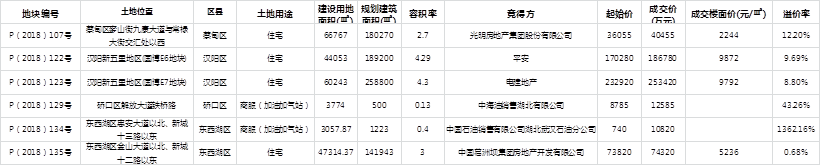 成交价格分析:11月武汉市土地市场共成交19宗地块,除位于蔡甸区的P(2018)128号地块为公开招标未设置起始价外,其余18宗地块中6宗地块溢价成交,溢价地块占比为33.33%。6宗溢价地块中,溢价率低于15%的共4宗,占总溢价地块的66.67%,均为住宅用地;溢价率高于15%的地块共2宗,占总溢价地块的33.33%,均为商服(加油加气)用地。除商服(加油加气站)用地外,武汉市溢价地块溢价率整体较低。