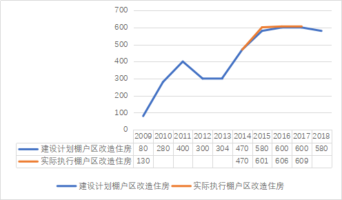 图2::2009-2018棚改计划与实际改造量(单位:万套)