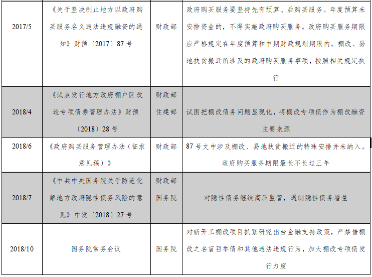 棚户区改造是纳入国家棚户区改造计划,依法实施棚户区征收拆迁、居民补偿安置以及相应的腾空土地开发利用等系统性工程;一直以来,在国发37号文政策庇护下,国家有关部门虽然多次出台政策,严禁违法违规或变相增加地方政府隐性债务,但一直都为棚改留下口子。政府购买棚改服务所发生的超过中期财政规划的项目融资,实质为增加地方政府隐性债务之行为。一方面,财政部87号文“党中央、国务院统一部署的棚户区改造工作中涉及的政府购买服务事项,按照相关规定执行”视为购买棚改服务的护身符;另一方面,财预28号文《试点发行地方政府棚户区改造专项债券管理办法》的下发,意图以显性债务(棚改专项债)取代隐形债务,但棚改专项债能否真正替代原来模式解决棚改资金问题尚待确定,直到作为层级最高的纲领性文件中发27号文出台,政府购买棚改服务形成的债务属于典型的政府隐性债务而受此文管控;且10月28日召开的国常会针对棚改,明确提出“严禁借棚改之名盲目举债和其他违法违规行为”,该会议要求加大棚改专项债发行力度,鼓励棚改专项债这类显性债务融资工具作为棚改主要资金来源,且有针对性地研究新的金融支持政策。这就进一步终止了87号文作为政府购买服务的护身符。