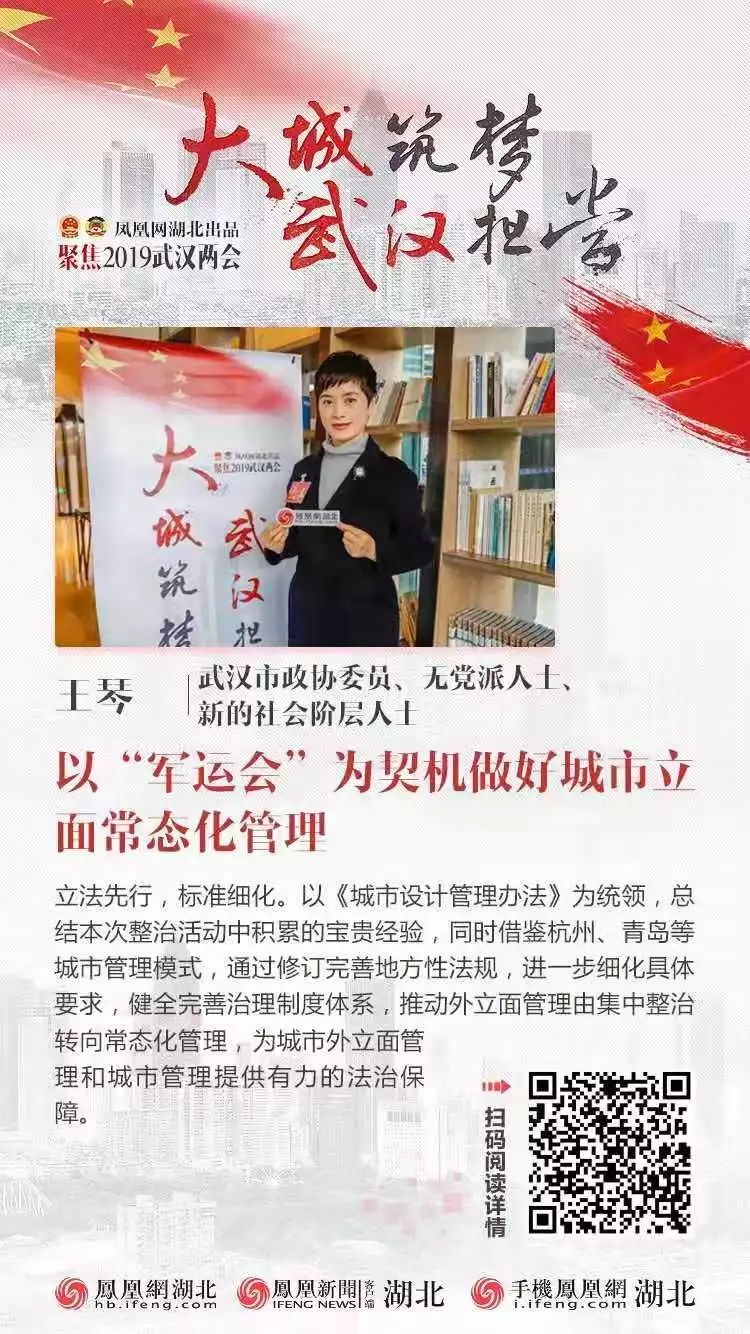 2019年1月4日至8日,政协武汉市第十三届委员会第三次会议在汉召开。武汉市政协委员、永业行常务副总裁王琴向大会提交了《 以“军运会”为契机做好城市立面常态化管理》、《推进农村宅基地“三权分置”试点 强化乡村振兴制度性供给》、《关于武汉市推进氢能汽车产业发展的建议》三份提案。连日来,这些关乎民生的提案受到各大媒体的普遍关注,凤凰网、长江商报、武汉电视台、武汉新闻广播等多家媒体对此进行了报道。