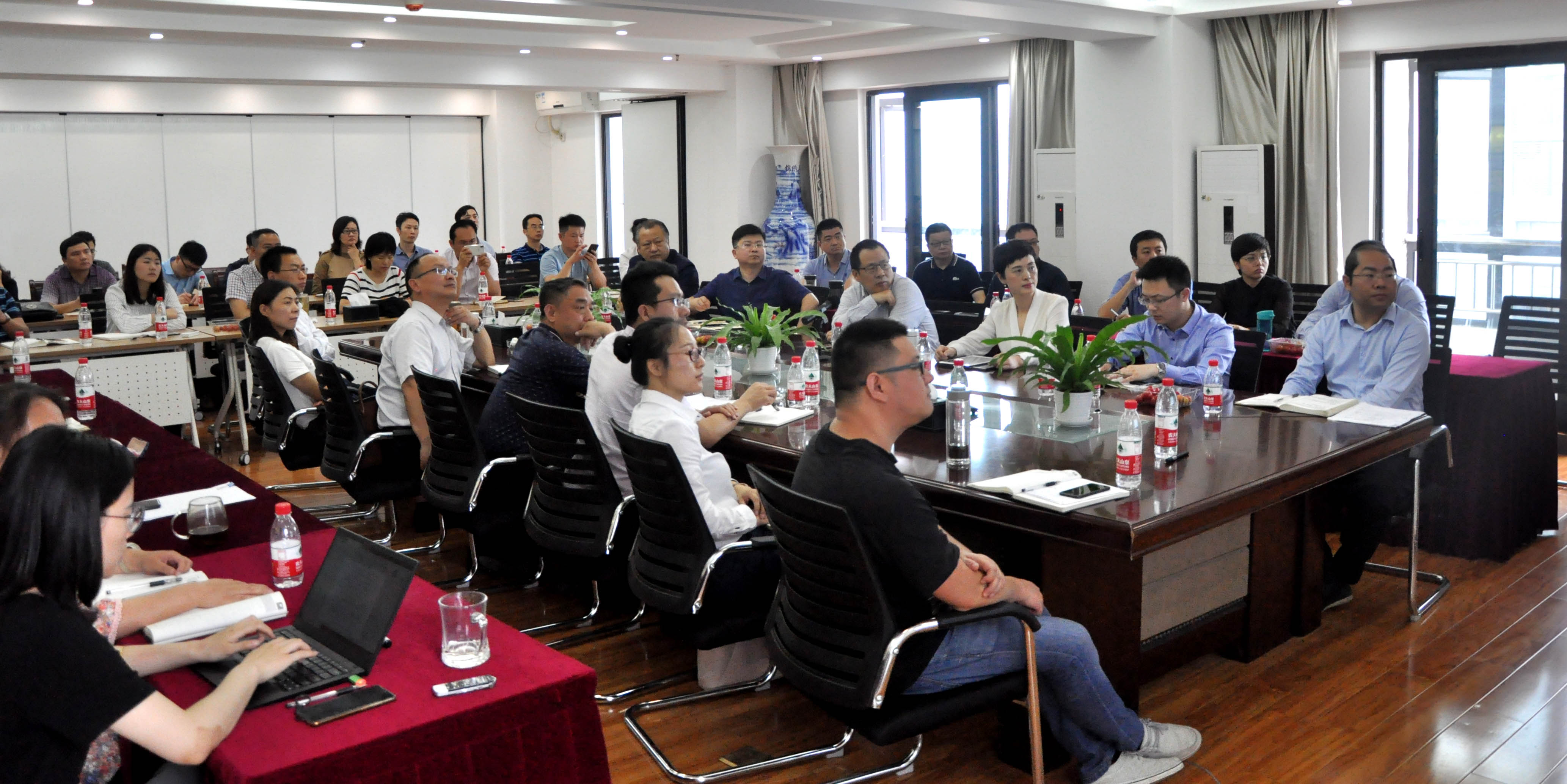 董事长兼总裁潘世炳,执行总裁王琴,副总裁雷小军、刘晓峰等高管,各业务部门负责人、市场总监、市场监督管理委员会全员、职能部门负责人参加会议,咨询业务总监文云波、国土业务总监吴学锋分别主持会议。