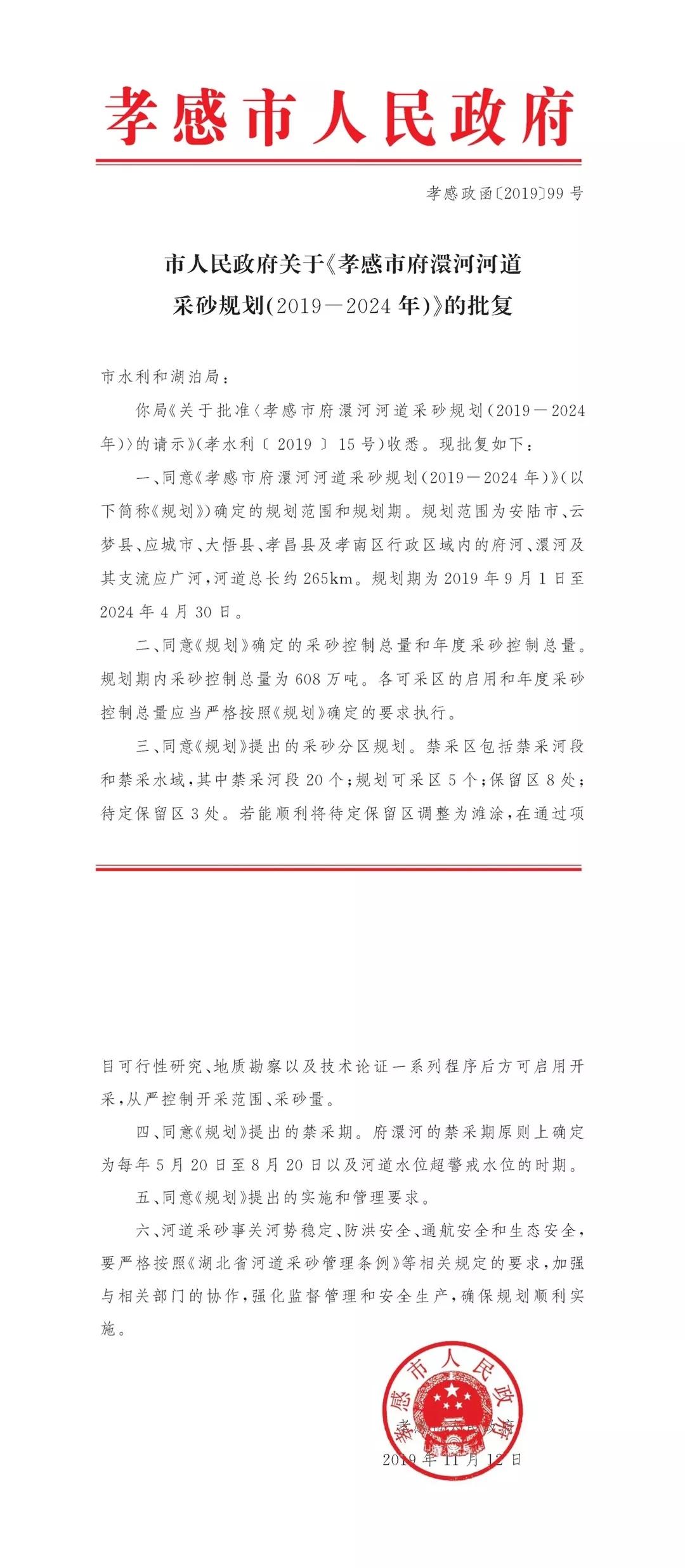 该规划为湖北省首个由省水利厅批准的中小河流河道采砂规划,涉及孝感地区安陆市、云梦县、应城市、大悟县、孝昌县以及孝南区行政区域内的府河、澴河及其支流应广河,为府澴河河道采砂许可和监管提供了技术依据,能够有效规范府澴河采砂活动,稳定府澴河河势,保障堤防防洪及涉水工程安全,做到合理开发利用河砂资源。