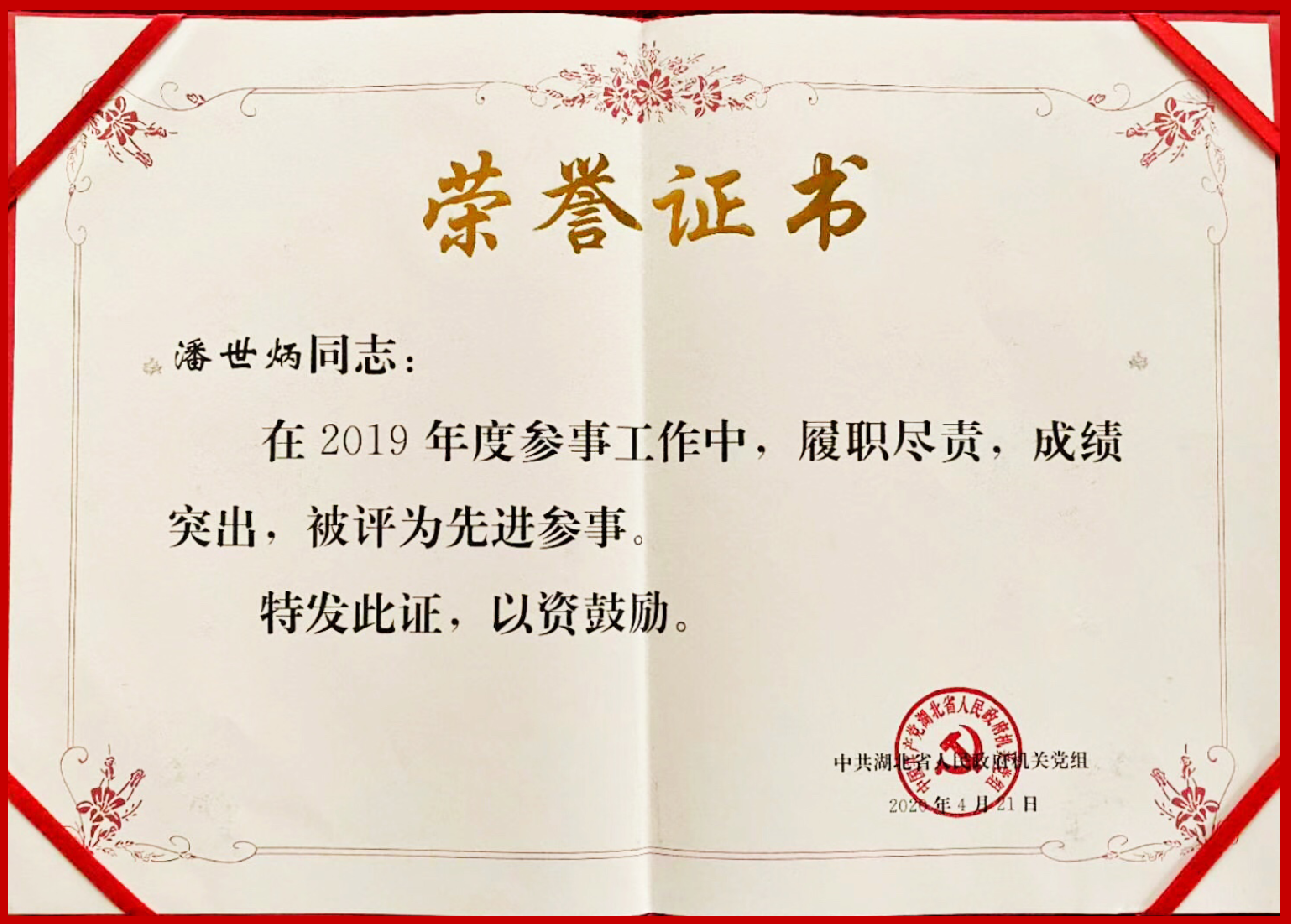 近日,中共湖北省政府机关党组印发《关于表彰2019年度先进参事和参事工作单项奖获奖参事的通报》,省政府参事、永业行董事长、总裁潘世炳荣获先进参事、参政建议一等奖。
