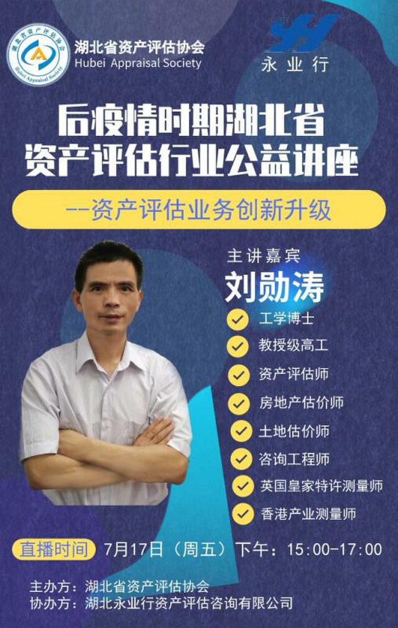 2020年7月17日,湖北省资产评估协会举办《后疫情时期湖北省资产评估行业公益讲座》,永业行资产评估部总经理刘勋涛受邀参会,并围绕资产评估业务创新升级作主题演讲。湖北省内众多行业专家、资产评估机构负责人及评估从业人员通过腾讯会议APP线上参加了此次研讨会。