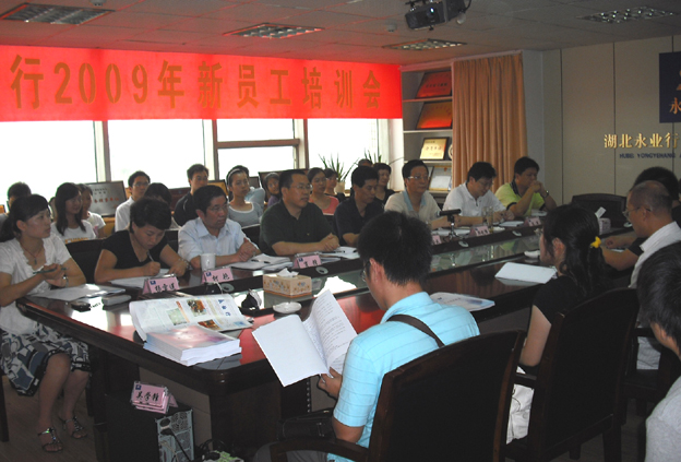 7月5日,2009年永业行新员工培训在公司会议室召开,董事长方国成,总裁潘世炳,副总裁靳剑辉、高军、李翔,助理总裁肖锋出席了培训活动,40多名新员工参加了培训。