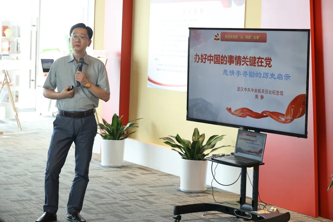 活动中全体成员重温入党誓词,认真聆听了由武汉中共中央机关旧址纪念馆副馆长、武汉市党史宣讲团成员周静讲授特色党课《办好中国的事情关键在党》,观看了区委组织部、区委宣传部指导拍摄的党史教育宣传片《珞珈红脉——周恩来在珞珈山》,区商务局、徐家棚街、中铁物贸、国能华中四名青年党会员代表朗诵红色诗歌《红船,从南湖起航》,全体党员合唱《没有共产党就没有新中国》,集体接受党史学习教育。