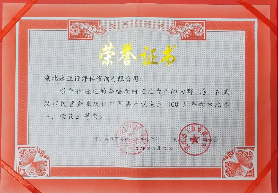 百年风雨沧桑,百年壮丽辉煌,我们迎来了中国共产党的百年华诞。6月25日下午,由武汉市委统战部、市工商业联合会举办的“武汉市民营企业庆祝中国共产党成立100周年歌唱比赛”在市青少年宫音乐厅隆重举行。在武昌区工商联会员企业党委的推荐下,永业行合唱团与来自全市各区工商联、工商联所属商会、会员企业的15支队伍纵情高歌,唱响红色经典。永业行合唱团以饱满的情绪深情献唱的经典歌曲《在希望的田野上》,以新颖的演唱形式、丰富的表演内容得到了专家评委和现场观众的认可,荣获比赛三等奖。