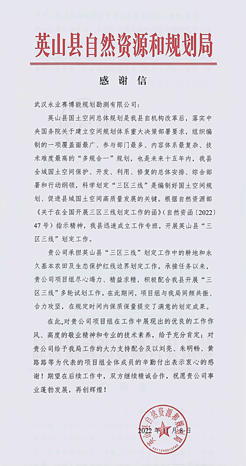 11月8日,英山县自然资源和规划局致函永业行,对我司承担的英山县永久基本农田、生态保护红线划定工作表示充分肯定和衷心感谢。