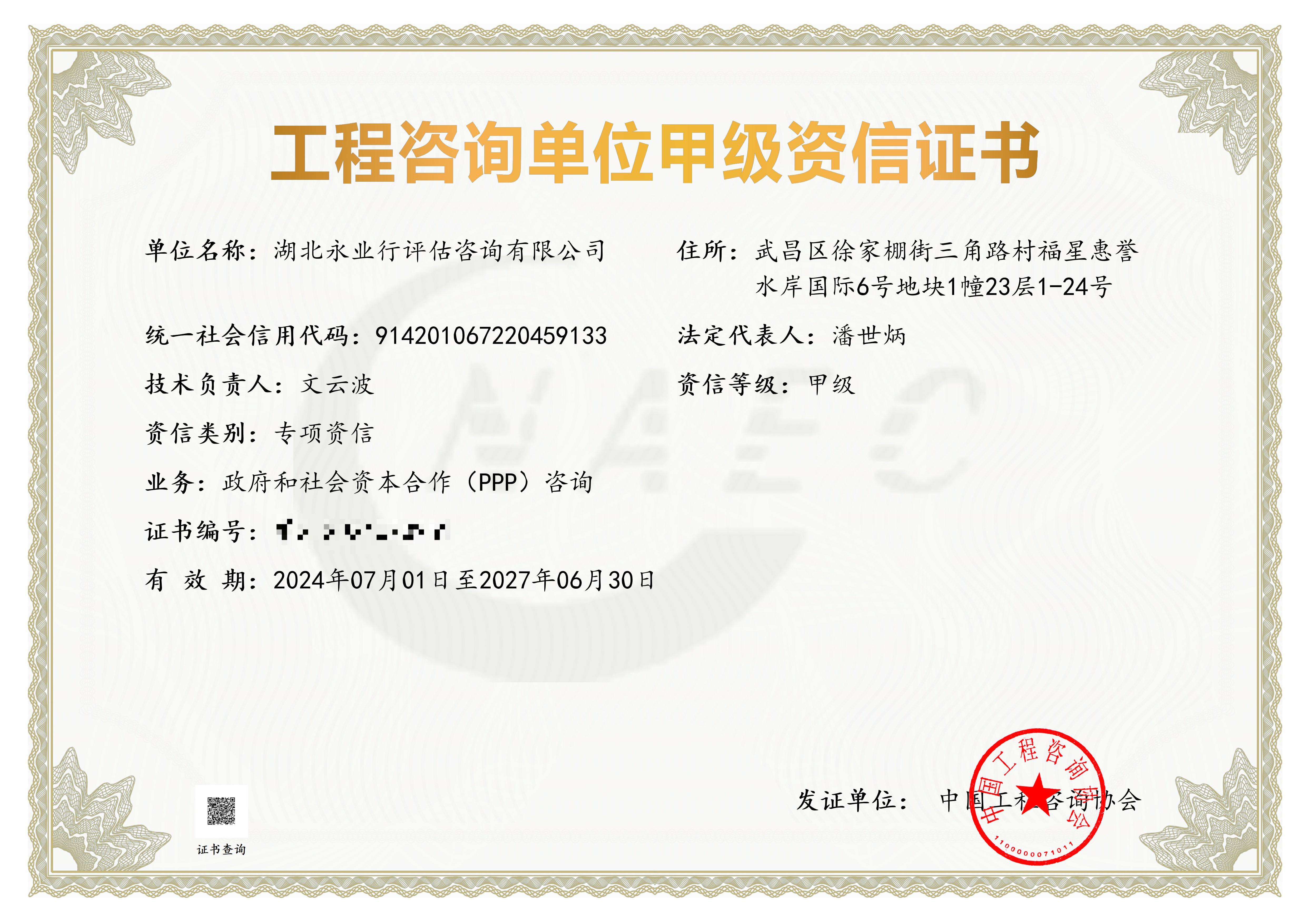 工程咨询单位甲级资信证书(政府和社会资本合作PPP咨询)
