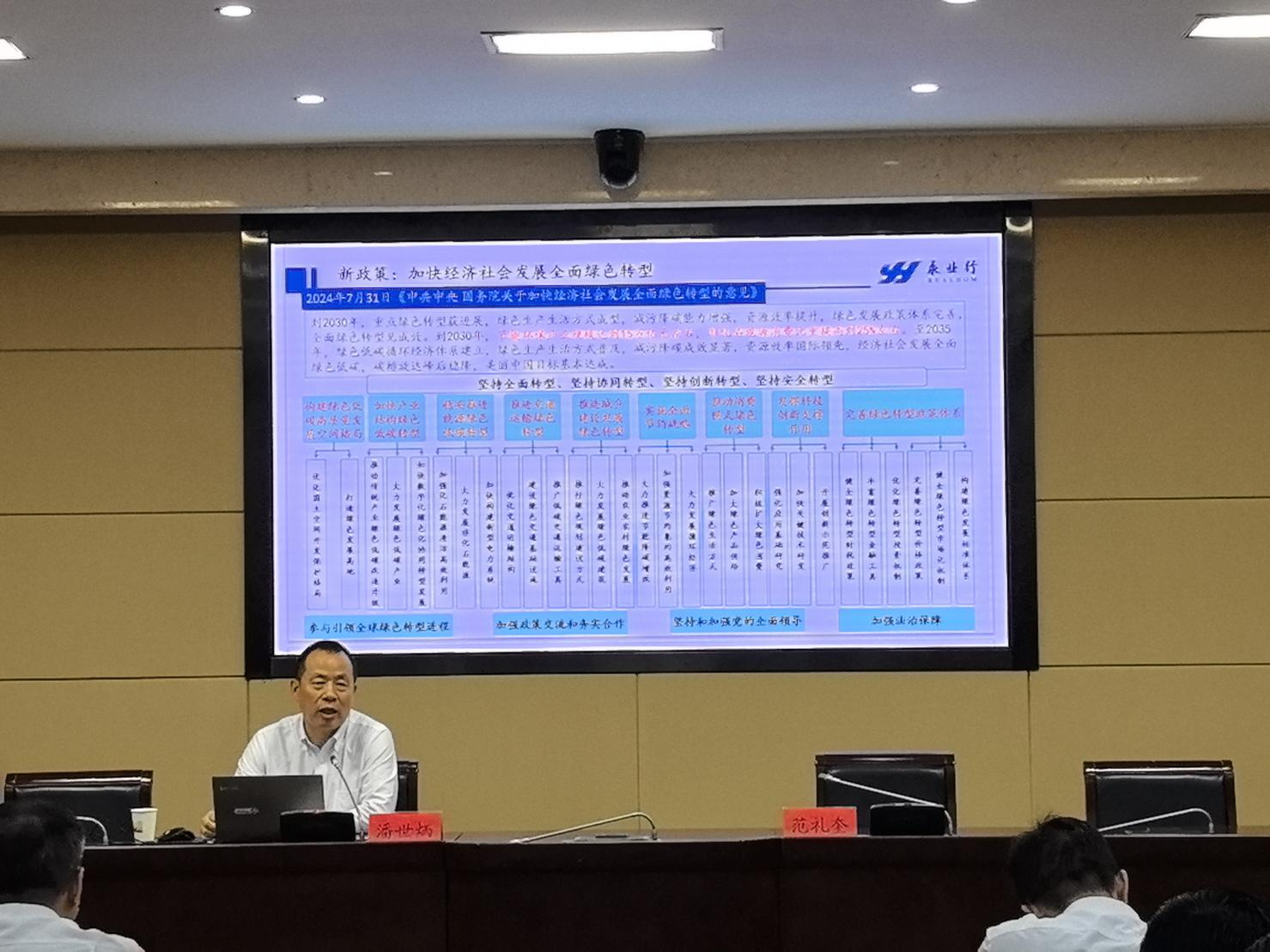 潘世炳立足当前绿色转型发展的新政策、新形势,作《碳资产配置+“三资”转换 赋能绿色低碳高质量发展》专题授课。他表示,2024年下半年以来,助力经济社会发展全面绿色转型的新政频出,对于推动发展方式绿色转型、全面推进美丽中国建设、实现高质量发展具有重要意义。他指出,面对当前绿色低碳发展的新形势,必须积极谋求以资源要素市场化协同配置为核心的新思路,即:以低碳为核心,以项目为载体,围绕“资源-资产-资本”转化路径,遵守资源要素市场化配置的原则,按照“规划-确权-整合-开发-利用-融资-运营-管理”流程,推进资源要素+“碳”一体化开发,实现资源利用项目实施全过程管理,助力地方双碳目标实现及经济社会全面绿色转型和高质量发展。同时,结合永业行实践案例,深入解读了摸清资源底数,实施要素管理;确认资产权属,资产价值显化;要素资源+项目+产业一体化谋划;创新投融资模式,多渠道筹措资金,保障项目落地等具体实施路径,为武昌区绿色发展转型提出了相关建议。