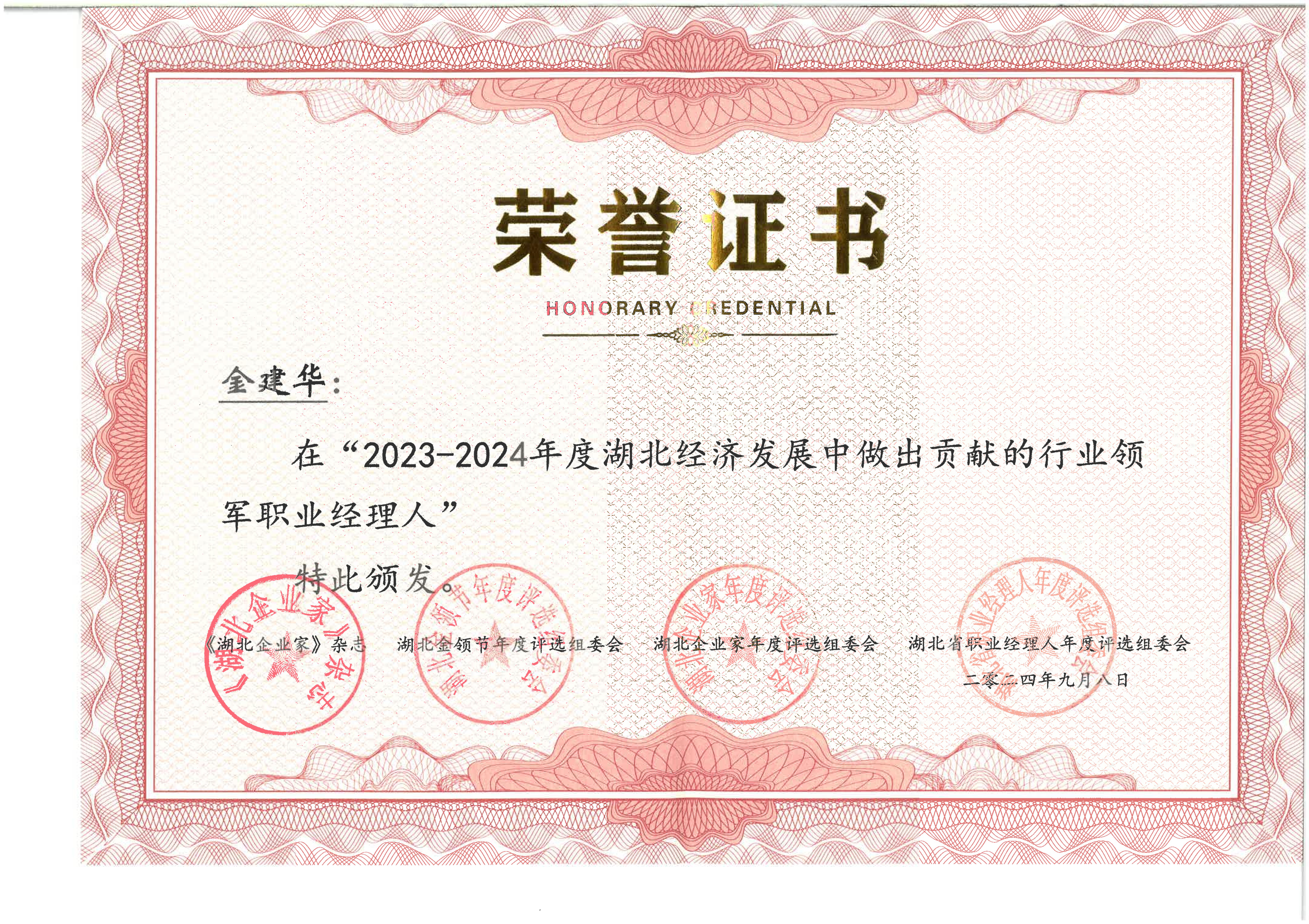 金建华荣获2023-2024年度湖北经济发展中做出贡献的行业领军职业经理人