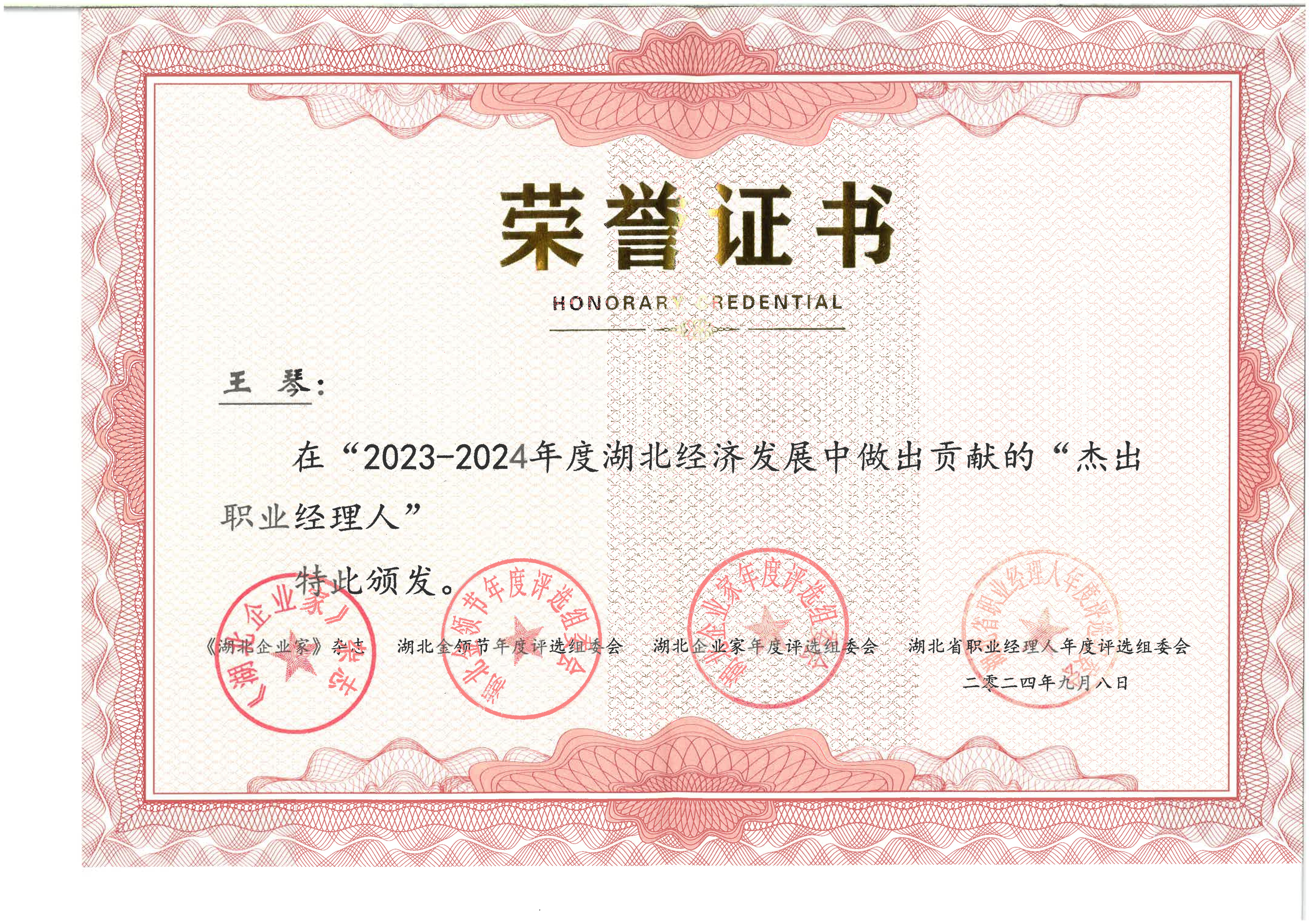 王琴荣获2023-2024年度湖北经济发展中做出贡献的“杰出职业经理人”