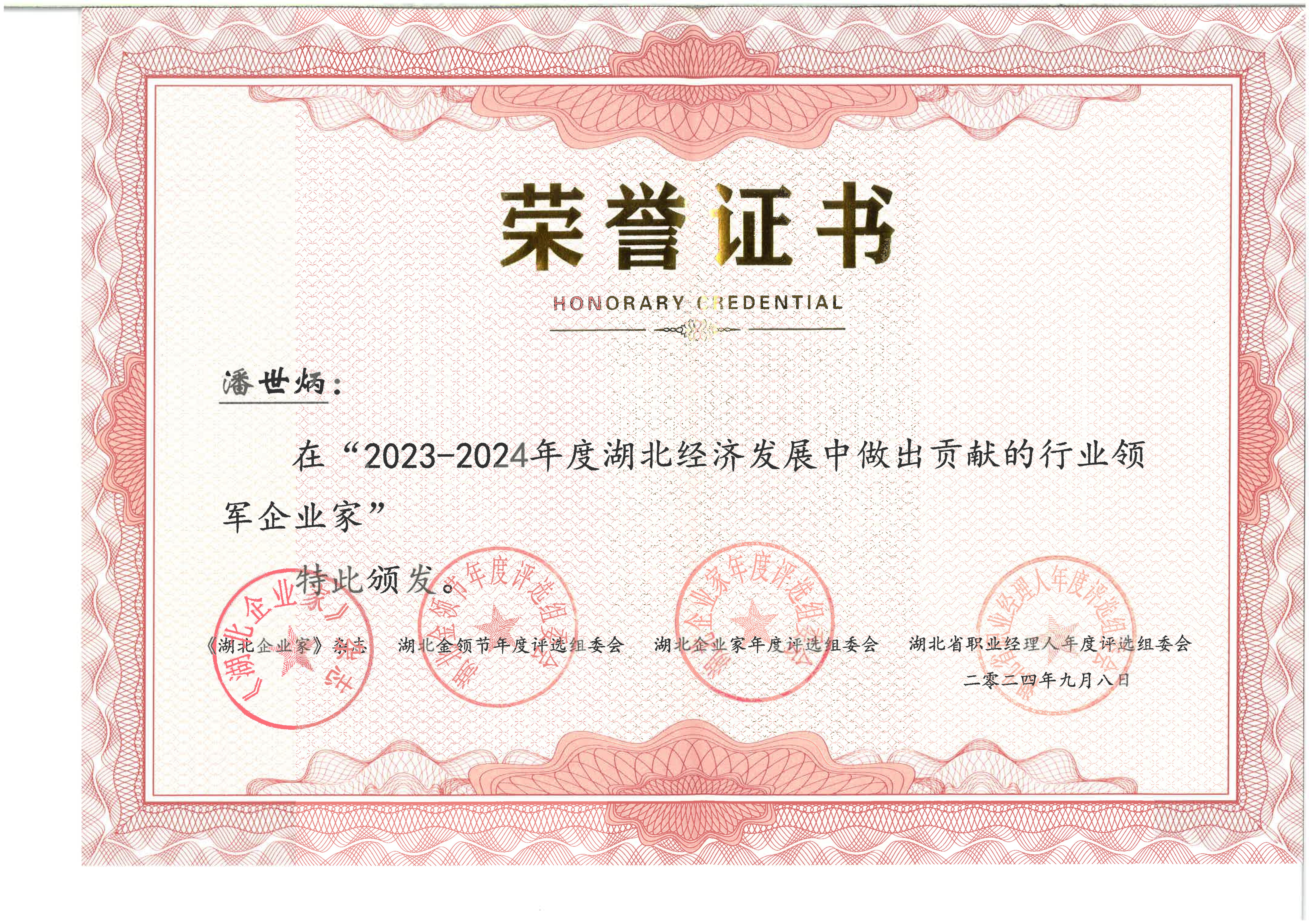 潘世炳荣获2023-2024年度湖北经济发展中做出贡献的行业领军企业家