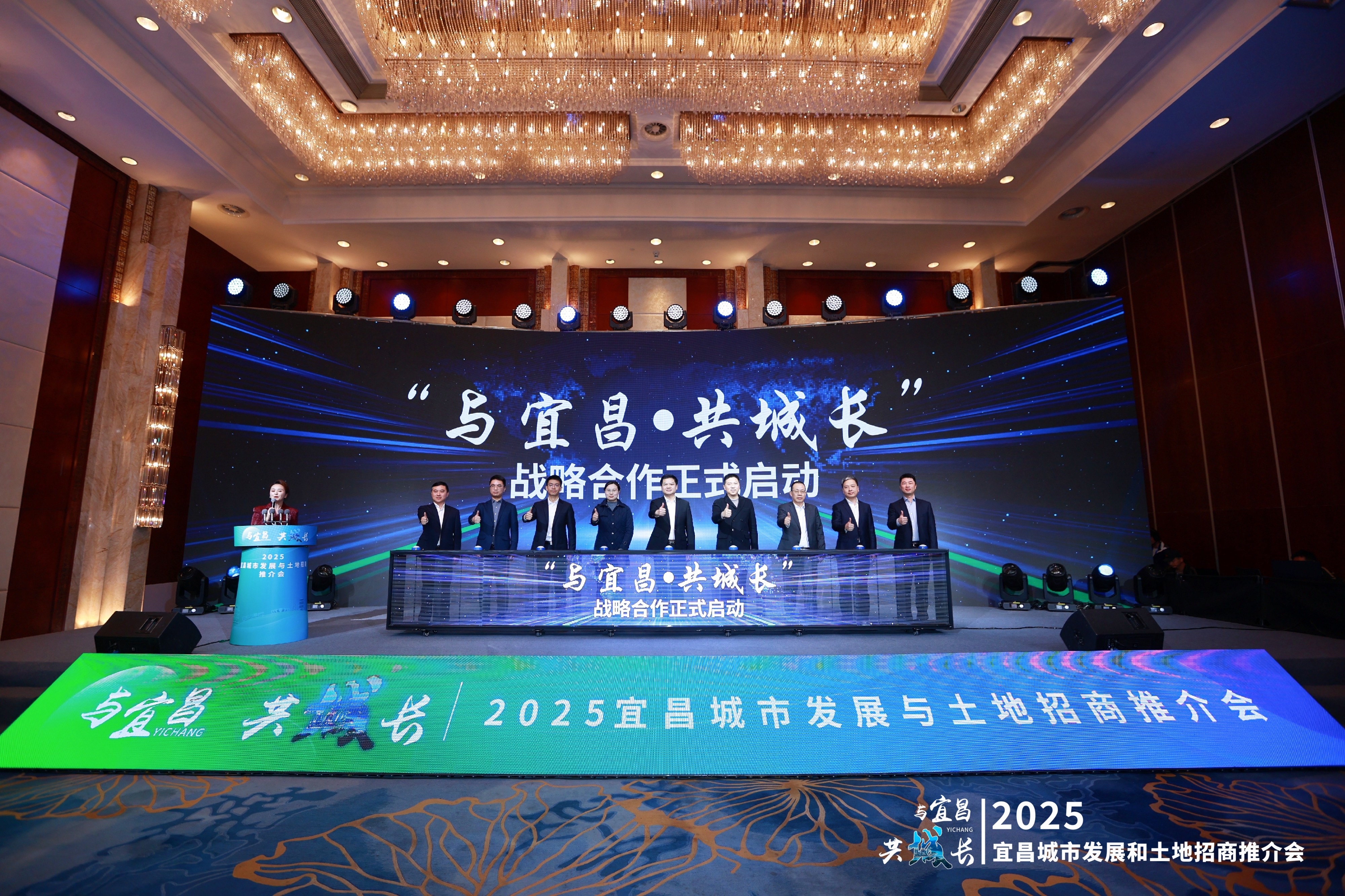 会议最后,阮斌、刘成、潘世炳等领导和嘉宾上台,共同启动“与宜昌·共城长”战略合作仪式。