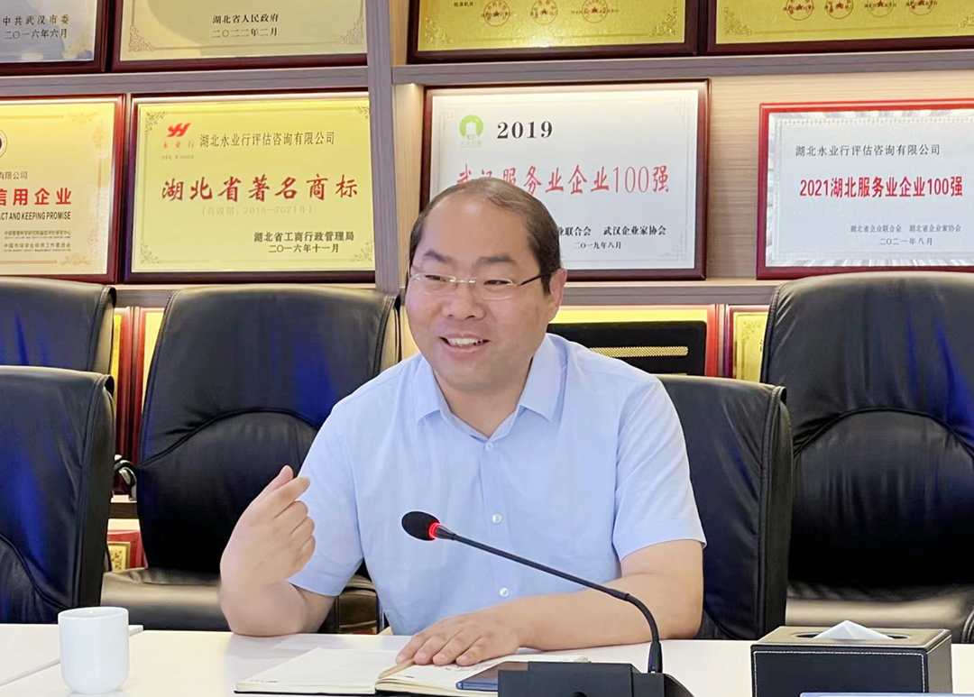 吴学锋对考察组一行表示热烈欢迎,感谢谷城县政府对永业行的信任和支持,并从发展历程、战略规划、业务布局、社会责任以及服务经济发展等方面介绍了永业行相关情况。
