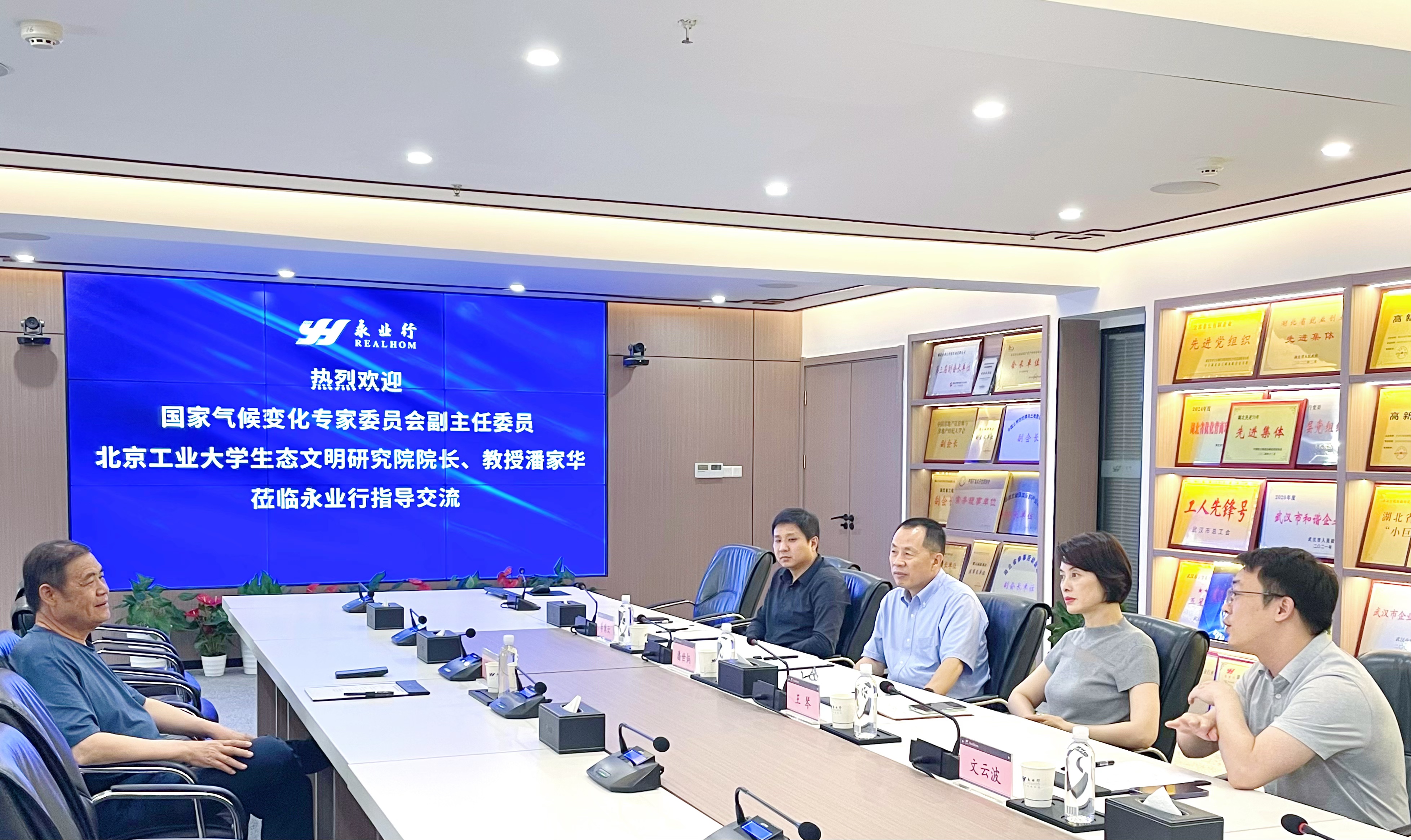 潘世炳对潘家华教授的到来表示热烈欢迎,介绍了公司的发展历程、资质荣誉、业务布局、创新研发等方面的情况。他表示,公司始终以国家战略为导向,在资源环境优化、生态环保治理、绿色金融创新、零碳园区建设等领域深耕细作,通过技术创新与模式探索,为政府部门和企业提供高质量服务,为推动绿色转型、服务支点建设、共建美丽湖北贡献永业行的智慧与力量。