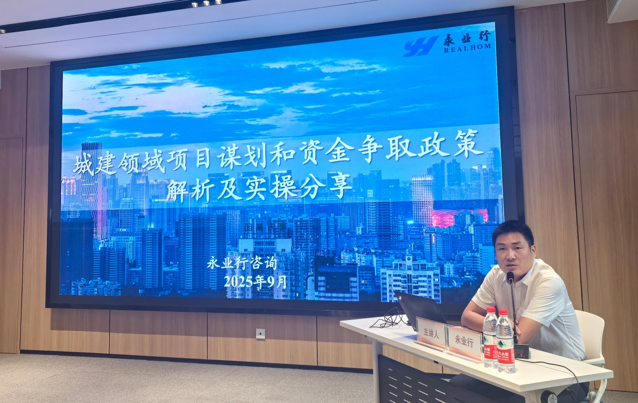 2025年9月18日,武汉洪山国控发展投资有限公司(简称“国投公司”)开展干部素质提升专题培训“红心赋能头雁训练营”暨“年轻干部助跑学堂”,永业行投资咨询事业群全过程咨询事业部执行总经理乐成银受邀为国投公司作“城建领域项目谋划和资金争取政策解析及实操分享”专题培训交流。