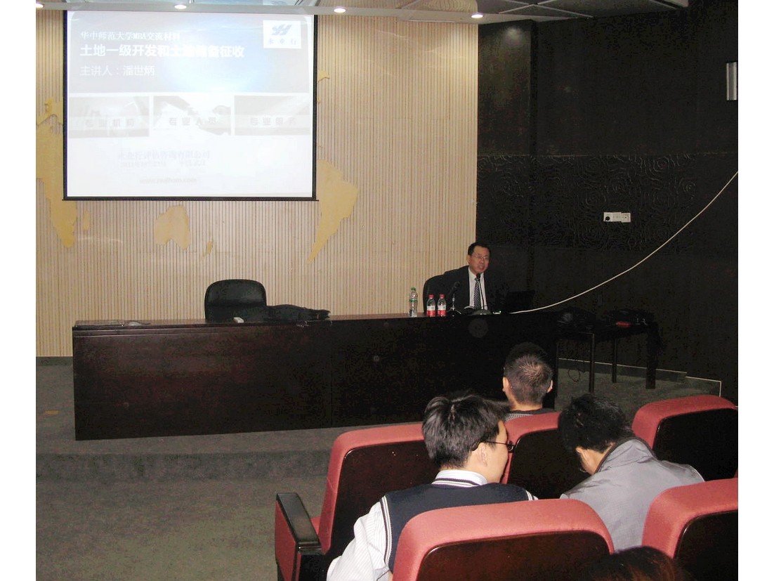 10月23日,应华中师范大学MBA教育中心邀请,永业行总裁、华中师范大学MBA研究生导师潘世炳在华中师范大学做了“土地一级开发和土地征收储备”的讲座。潘总围绕着土地一级开发及土地征收储备基本概念、基本流程及相关技术、法律问题与同学们进行了交流,同时对目前的房地产市场进行了分析,并回答了同学们的提问。本次讲座由华中师范大学经济学院院长邓鸿乾教授主持,华中师范大学MBA学员120余人参加了讲座。