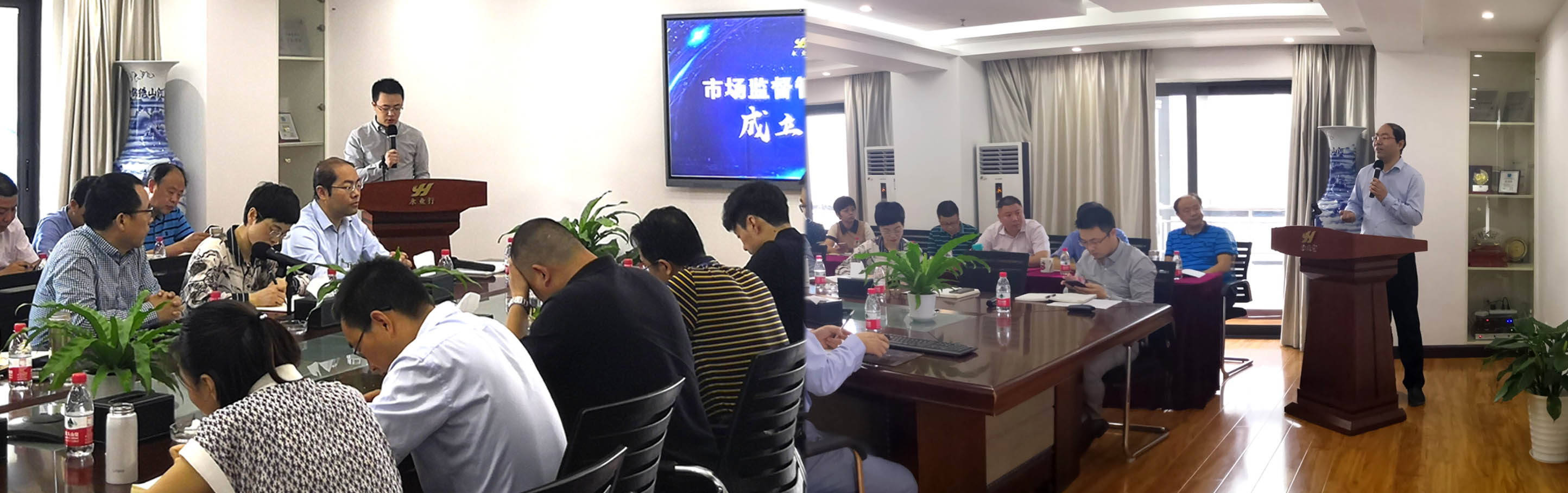 董事长兼总裁潘世炳,执行总裁王琴,副总裁雷小军、刘晓峰等高管,各业务部门负责人、市场总监、市场监督管理委员会全员、职能部门负责人参加会议,咨询业务总监文云波、国土业务总监吴学锋分别主持会议。