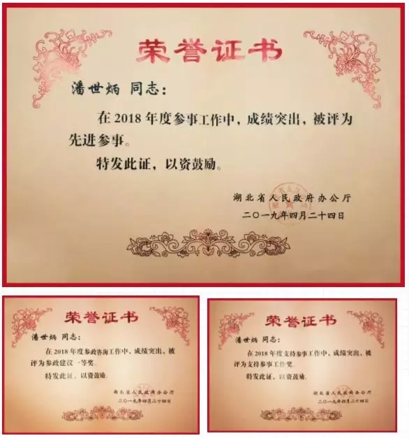 永业行董事长兼总裁潘世炳受聘为省纪委监察委首批特约督查员;当选为中估协第五届常务理事,为湖北唯一的常务理事;获得先进参事奖、参政建议一等奖和支持参事工作奖、湖北省优秀企业家(金牛奖)称号。