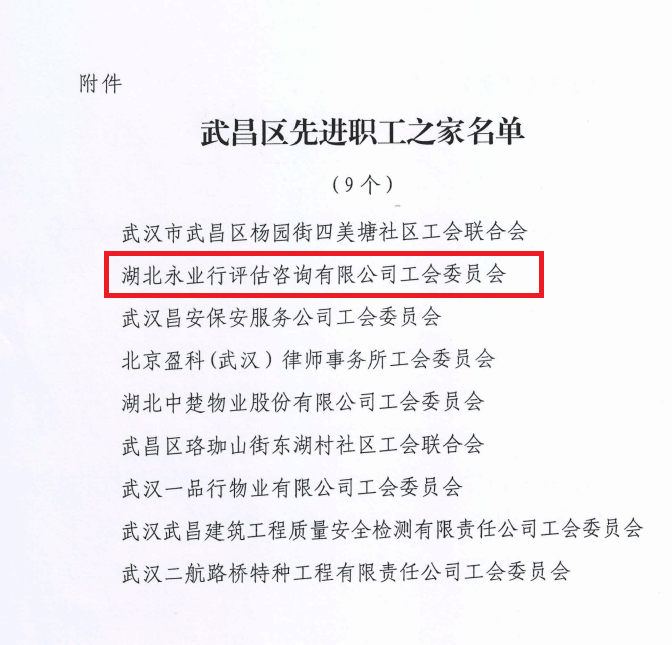 近日,武汉市武昌区总工会发布 《关于武昌区先进职工之家、先进职工小家评定结果的通报》 ,永业行获评武昌区先进职工之家。
