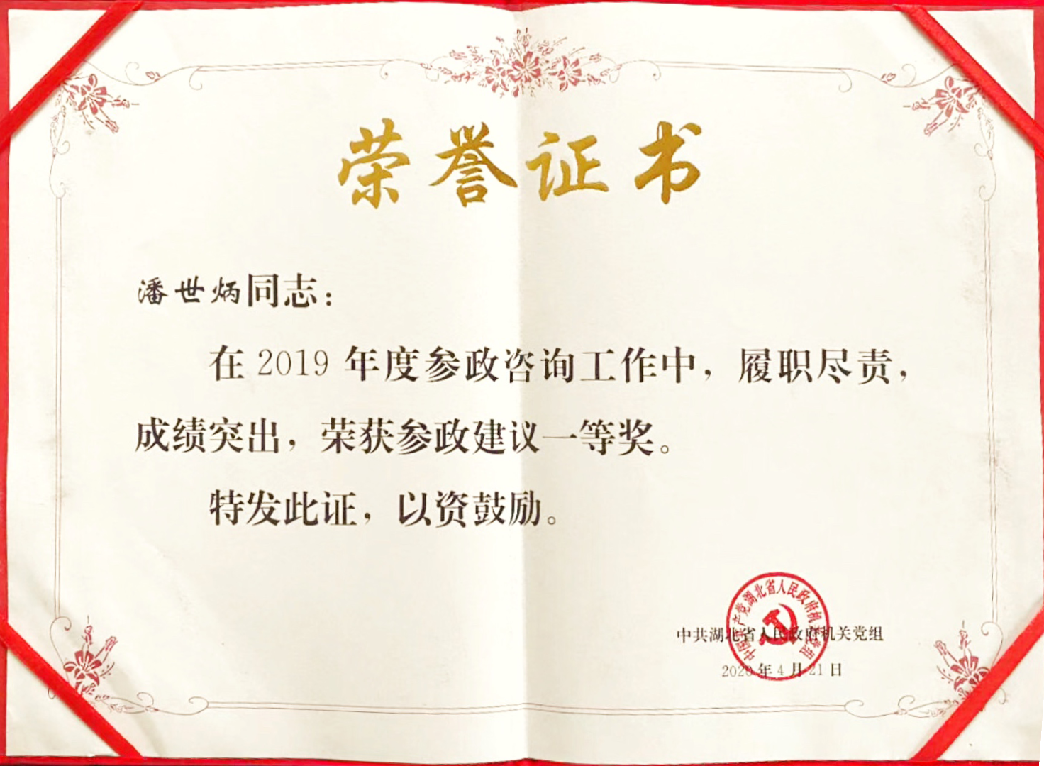 近日,中共湖北省政府机关党组印发《关于表彰2019年度先进参事和参事工作单项奖获奖参事的通报》,省政府参事、永业行董事长、总裁潘世炳荣获先进参事、参政建议一等奖。