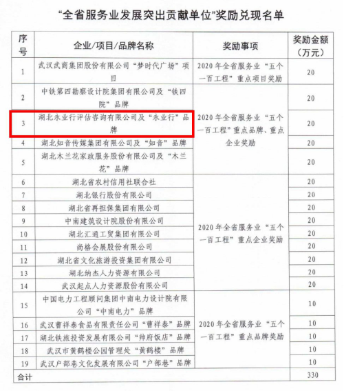 本次入围全省服务业“五个一百工程”重点品牌、重点企业名单,是对永业行的再次肯定与激励。永业行将一如既往的提升专业水平和服务能力,更好的履行社会责任和义务,为经济社会发展作出更大贡献。