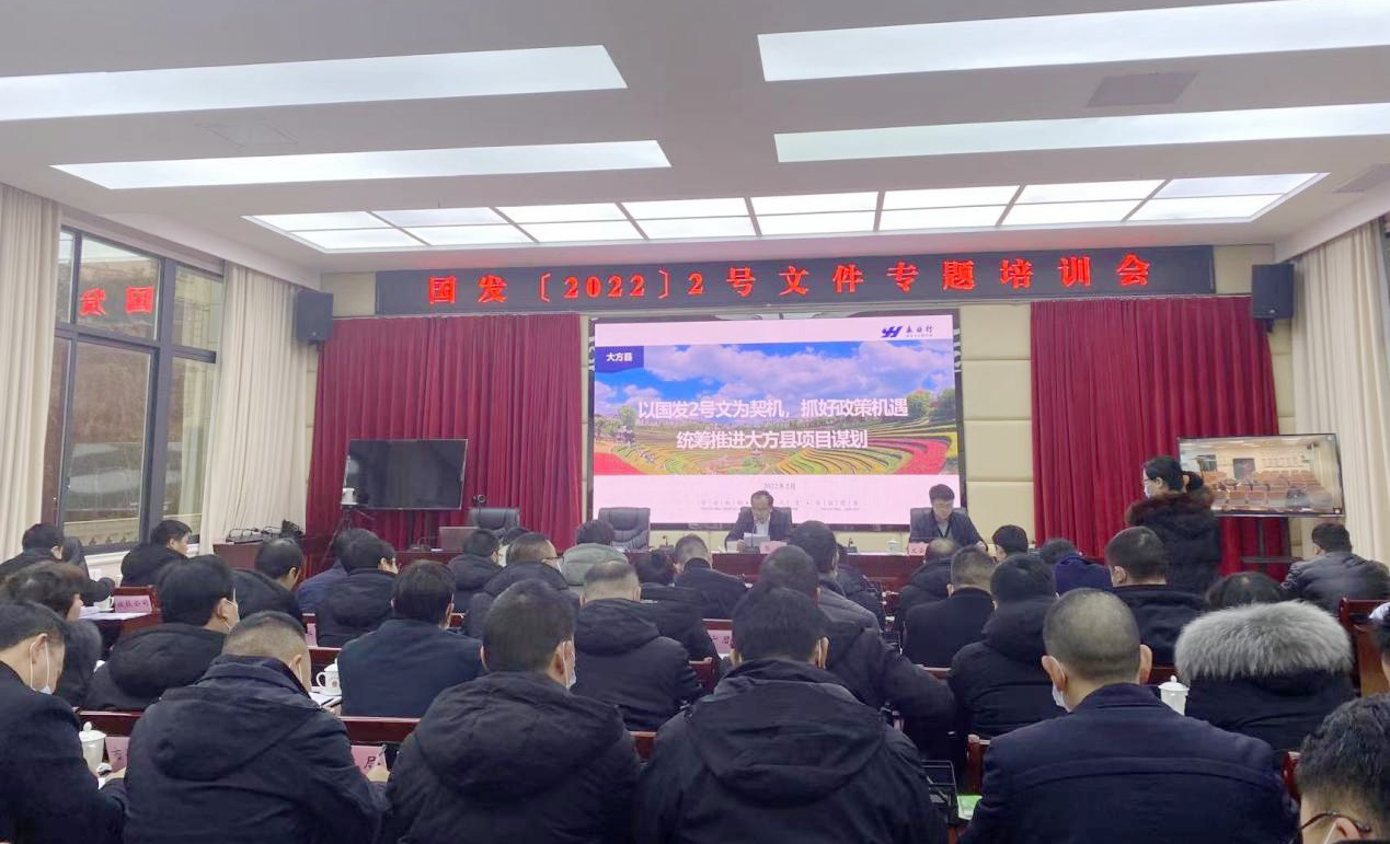 2022年2月24日,永业行副总裁文云波应邀为大方县作“以国发2号文为契机,抓好政策机遇,统筹推进大方县项目谋划”专题交流培训。大方县委常委、常务副县长张铭出席并主持会议。