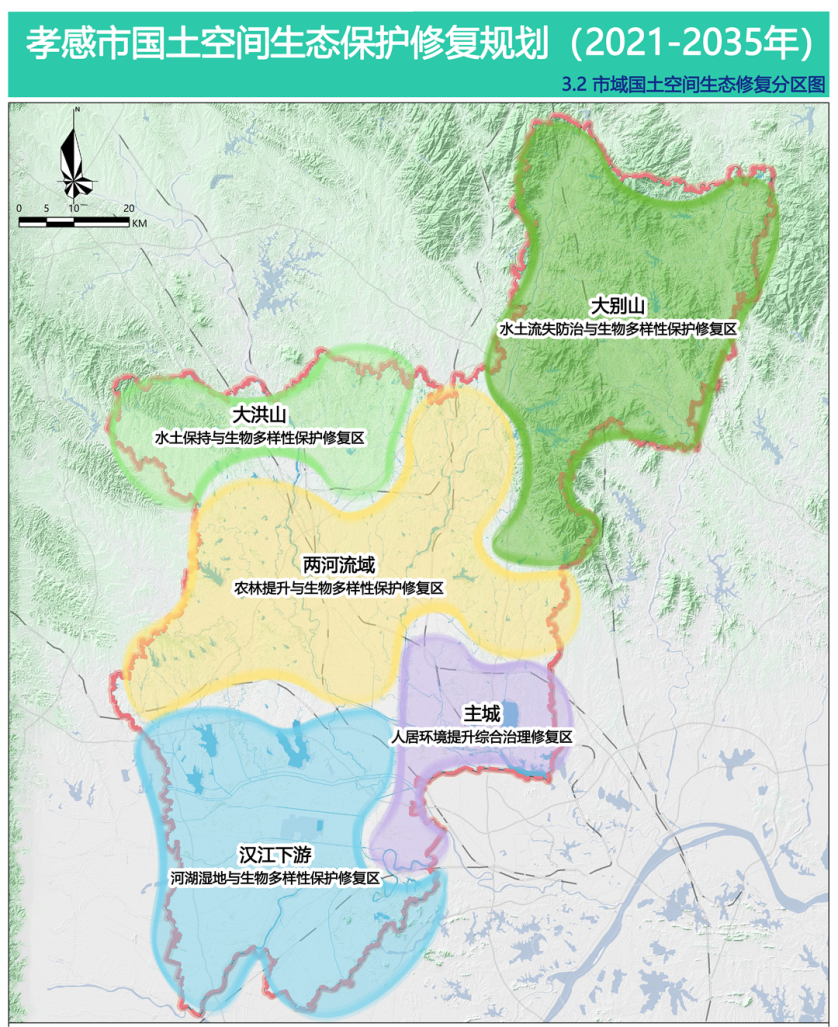 在上位规划确定的生态保护格局基础上,根据孝感市“双评价”结果,结合国家及区域重大战略,统筹考虑山水林田湖草沙生态系统特征及问题,划分生态保护修复分区。