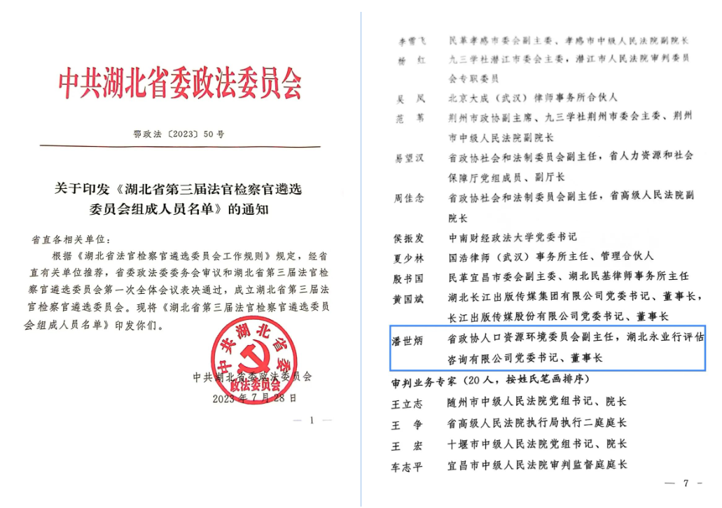 2023年7月28日,湖北省第三届法官检察官遴选委员会第一次全体会议在武汉市东湖宾馆召开。省委常委、政法委书记肖菊华到会祝贺并讲话。省高级人民法院党组书记、院长游劝荣主持会议。省人民检察院党组书记、检察长王守安宣读第三届遴选委员会组成人员名单。省政协常委、永业行党委书记、董事长潘世炳受聘为湖北省第三届法官检察官遴选委员会专家委员。